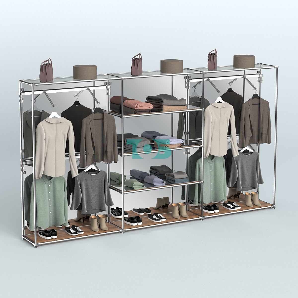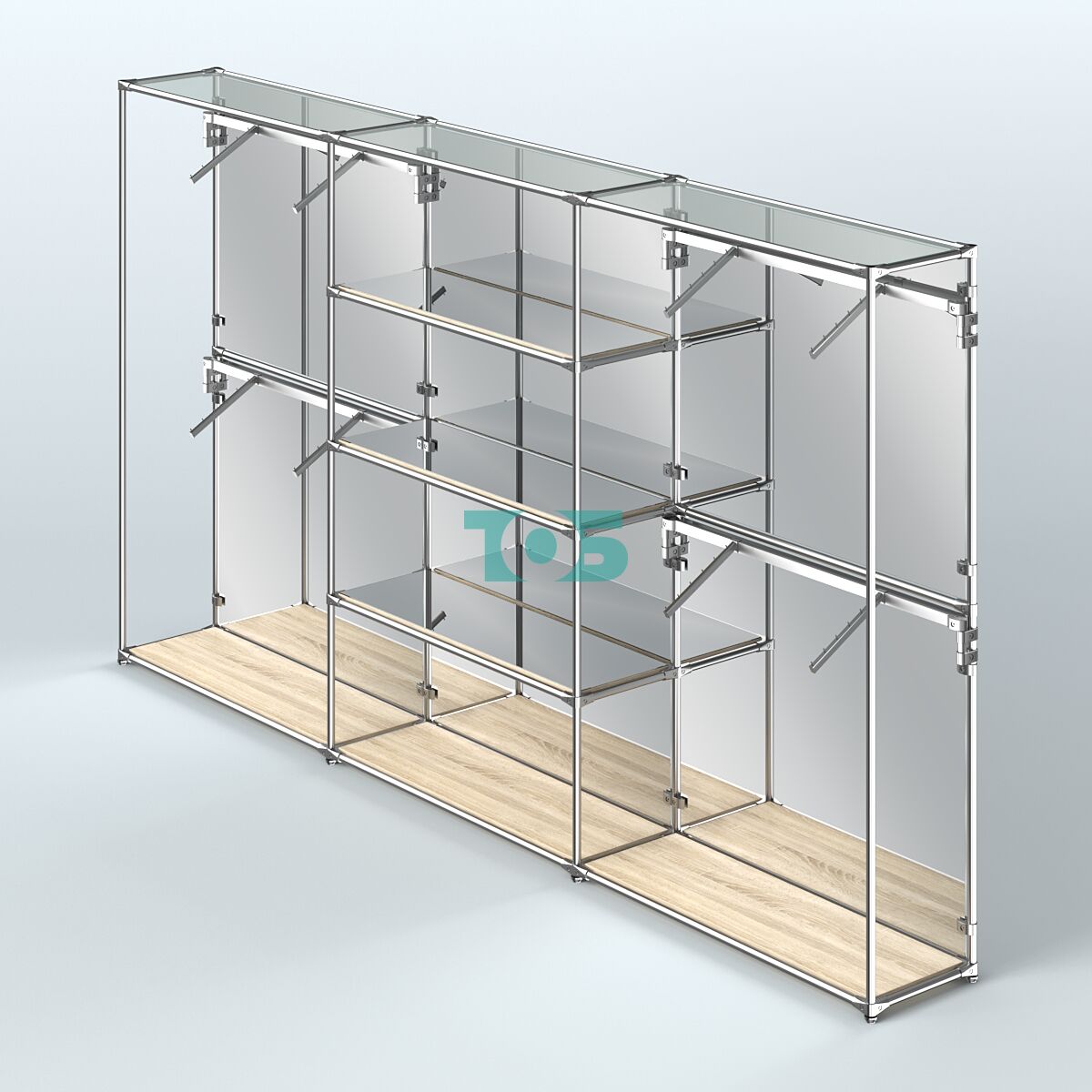 Отличия модели торговой системы ХРОМ (задняя стенка - зеркало) 3600 мм с зеркальными полками и поручнями №5: