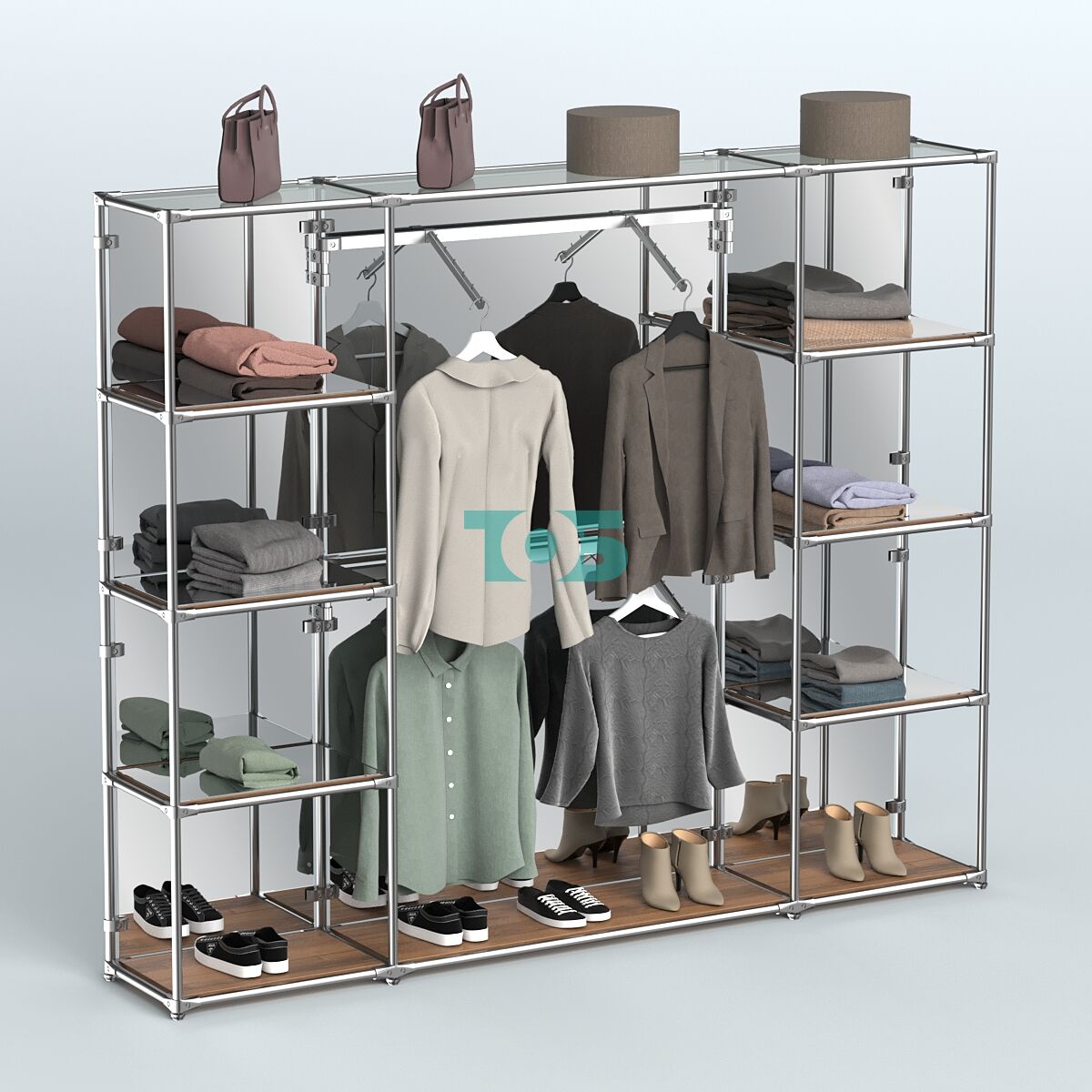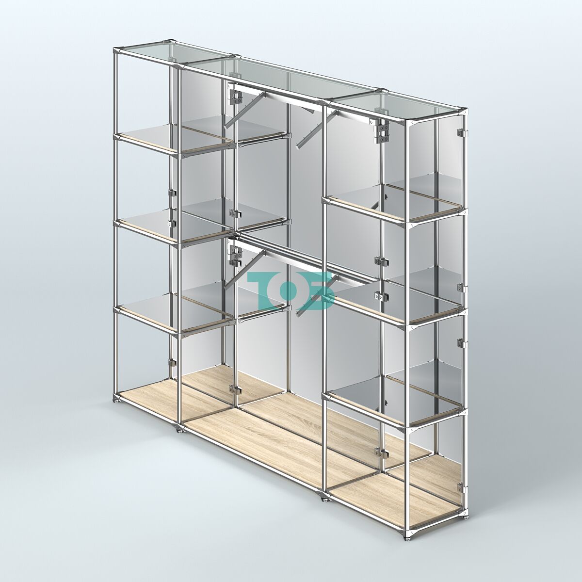 Отличия модели торговой системы ХРОМ (задняя стенка - зеркало) 3600 мм с зеркальными полками и поручнями №7: