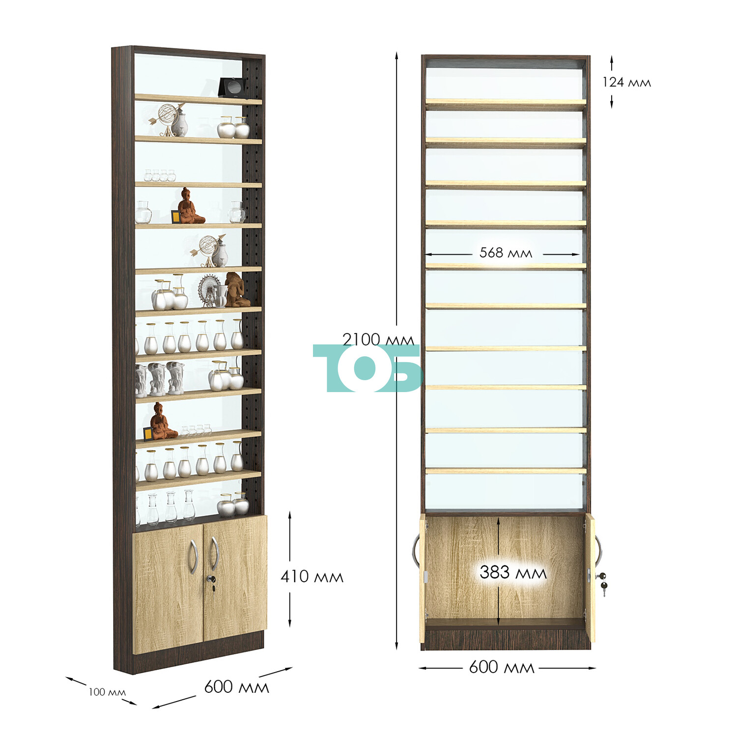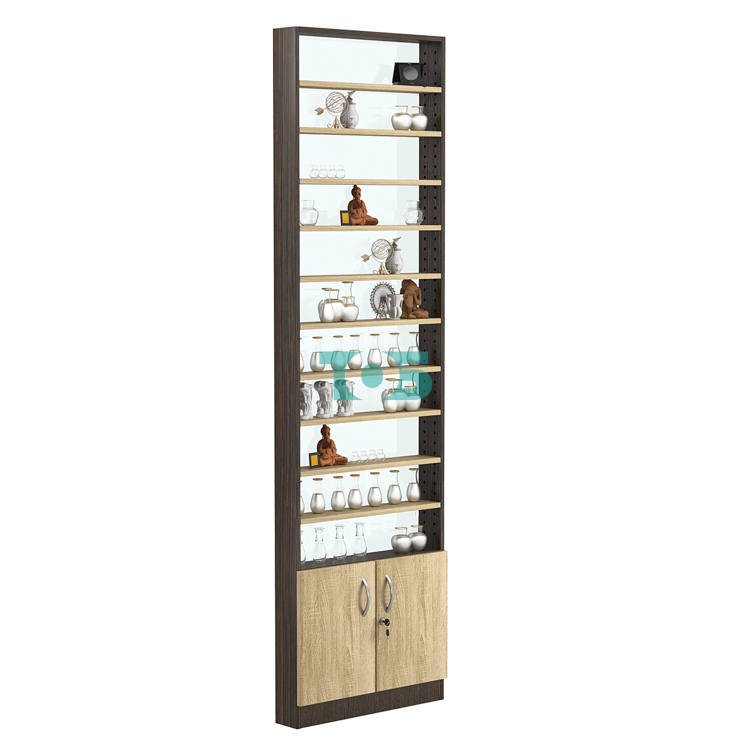 • Стеллаж из ДСП с 10-ю полками 100x600 мм серии LEVEL-10 №1-1 (З/C - СТЕКЛО), Ясень Анкор темный + Ясень Анкор светлый