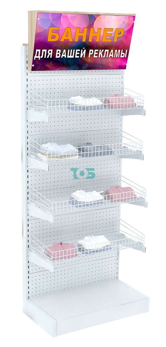 - задняя стенка стеллажа белая, перфорированная - можно использовать для крючков под вывеску товара;
