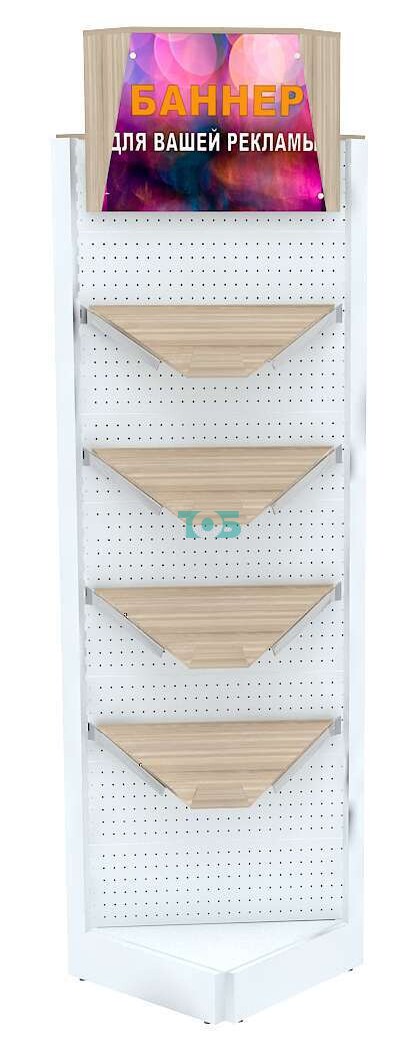 - стеллаж включает четыре наклонные полки с бортиком из ДСП 16 мм в комплекте с хромированными полкодержателями для демонстрации Товара покупателю;