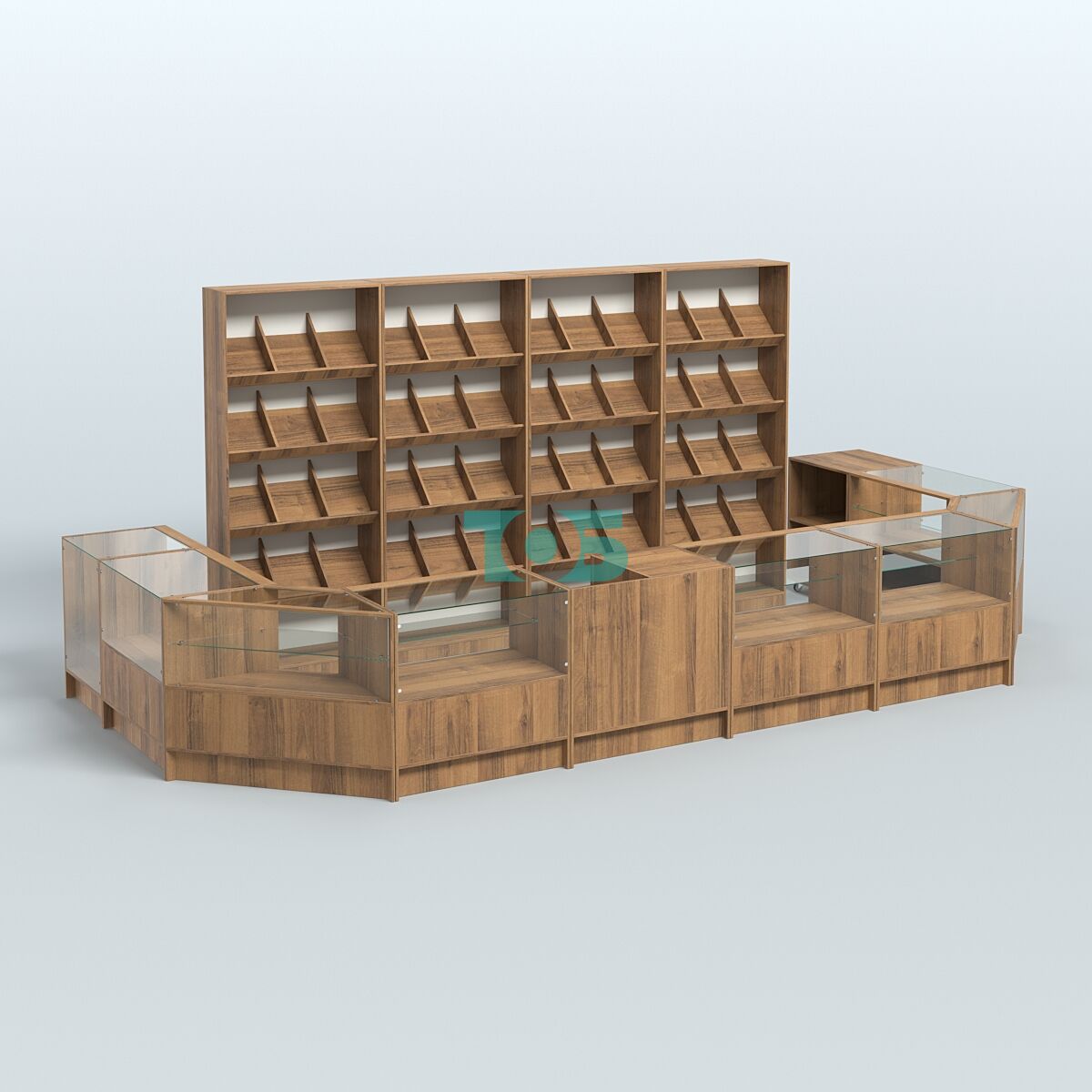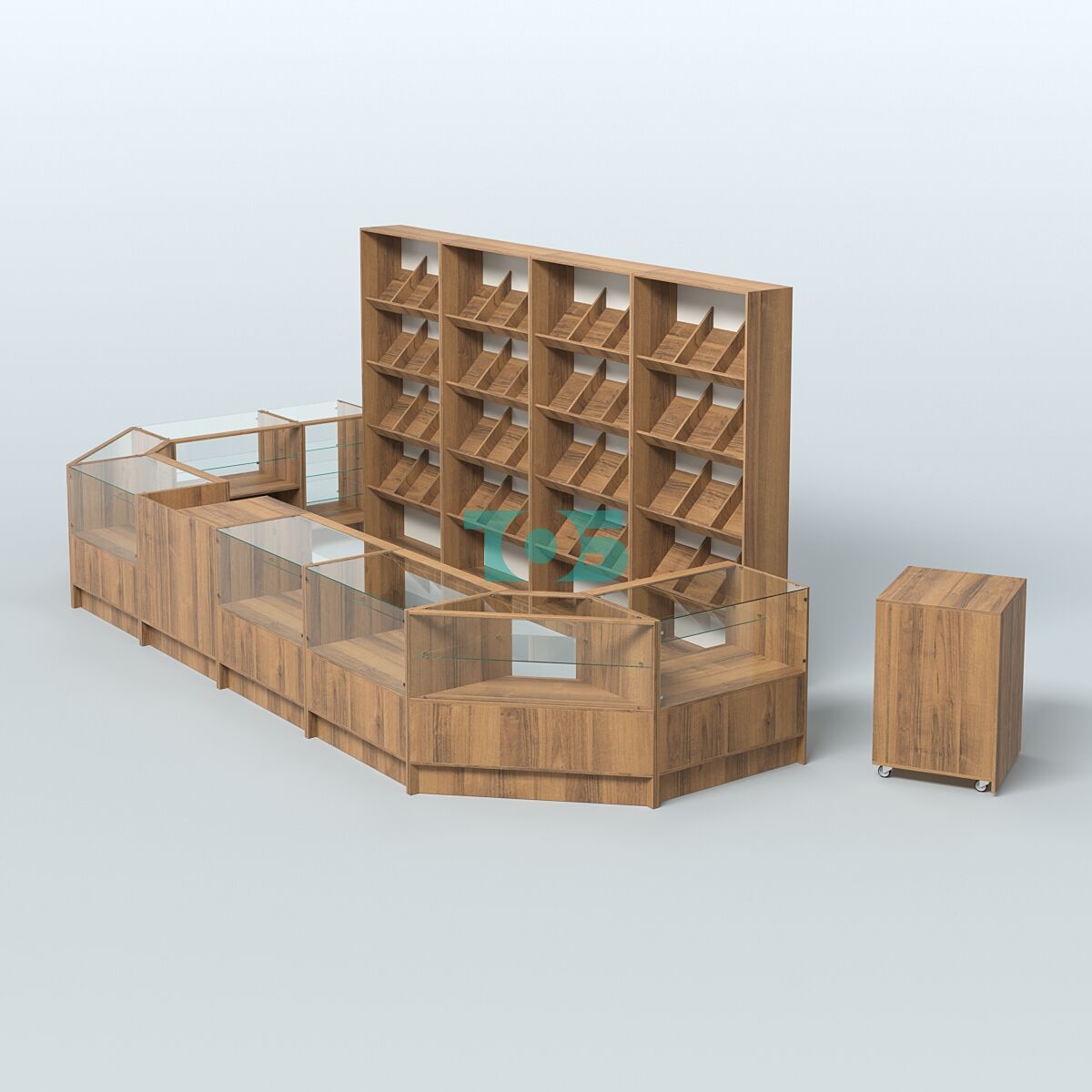 Стеллажи: за спиной продавца стоят стеллажи высотой 2100 мм, что позволяет эффективно использовать вертикальное пространство для размещения товаров.
