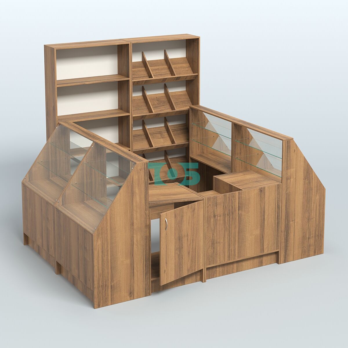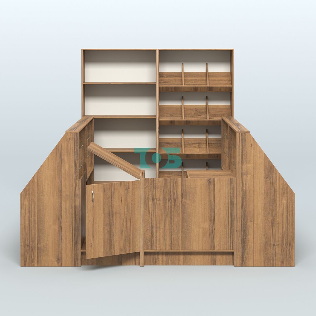 • Стеллажи: за спиной продавца стоят стеллажи высотой 2100 мм, что позволяет эффективно использовать вертикальное пространство для размещения товаров.
