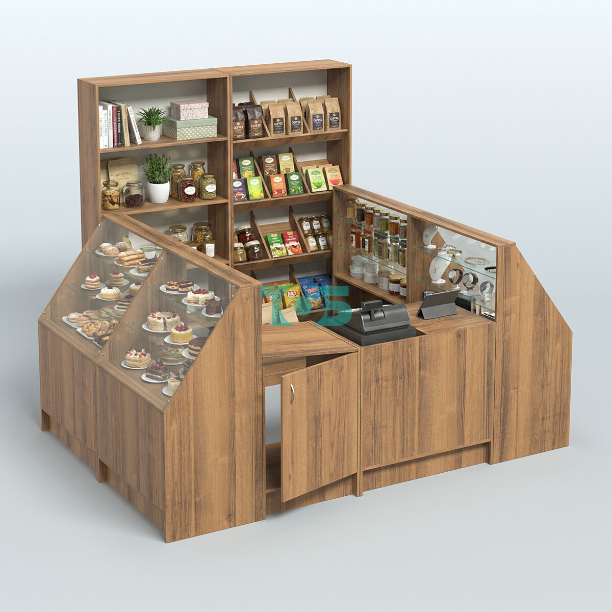 • Витрины: со стороны продавца витрины открытые, что обеспечивает хороший обзор товаров и облегчает взаимодействие с покупателями.