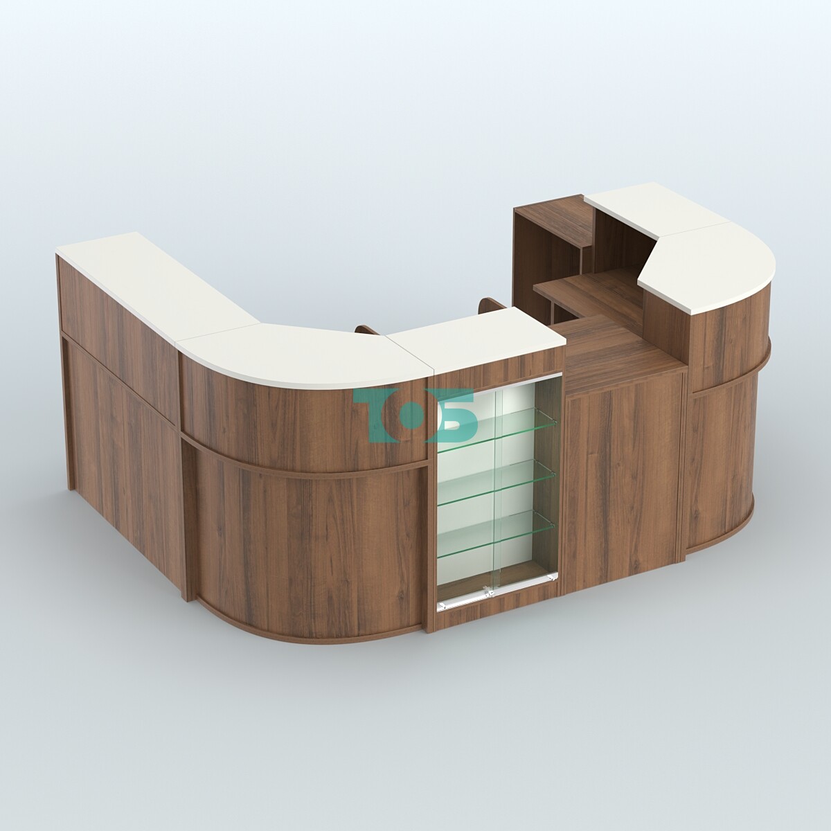 - фасад прямоугольного ресепшена Лайт представляет из себя витрину с тремя стеклянными полками. Верхний фриз витрины укомплектован двумя светильниками, которые освещают товар на полках. Лицевая часть витрины защищена раздвижными стеклянными шторками на мини роликовых направляющих (аналог шкафа-купе) и закрывается на врезной замок. Со стороны продавца предусмотрен выдвижной ящик с замком и ниша с полкой, куда удобно складировать коробки с товаром и пр;