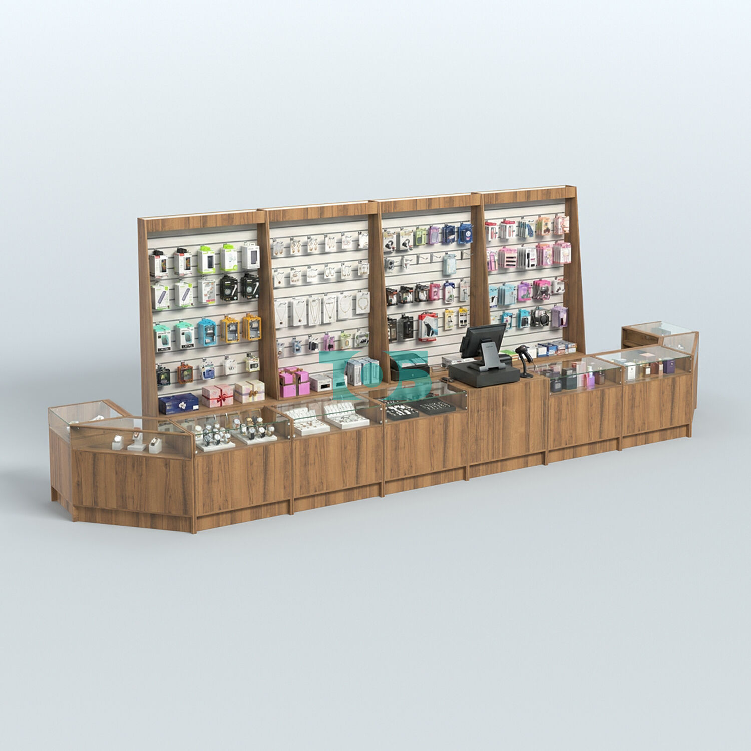 Стеллажи: за спиной продавца стоят стеллажи с экономпанелью высотой 2400 мм, что позволяет эффективно использовать вертикальное пространство для размещения товаров.