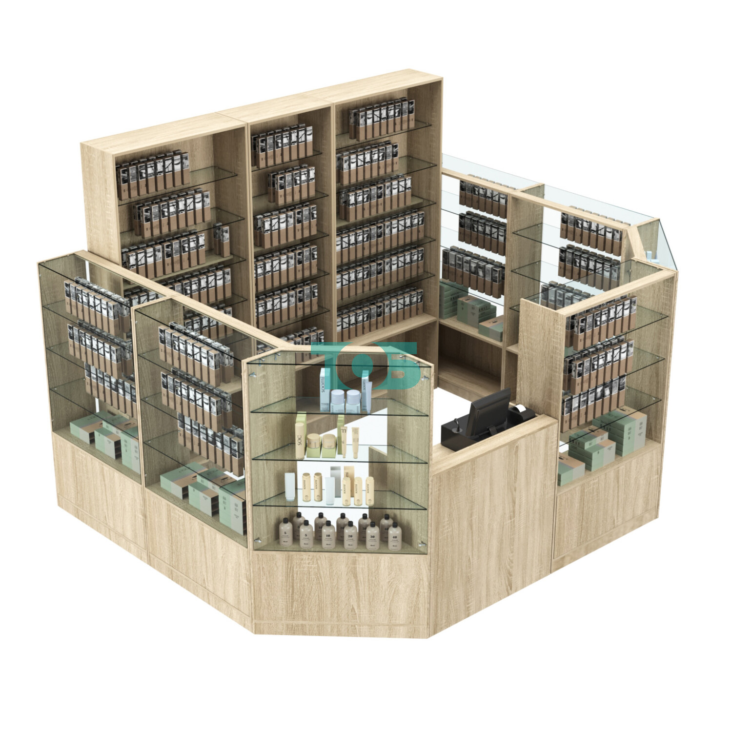 Стеллажи: за спиной продавца стоят стеллажи, которые можно доукомплектовать нижними дверцами на высоту 410 мм и 810 мм. Это расширяет возможности для организации хранения товаров.
