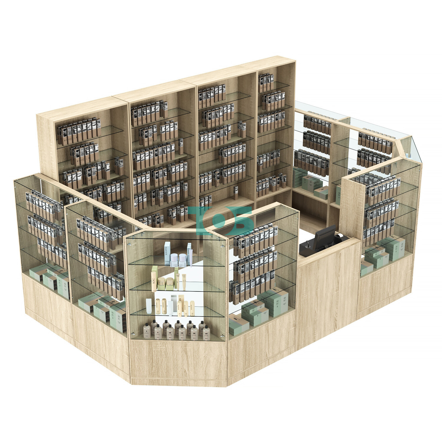 Дополнительные возможности: за спиной продавца можно поставить стеллажи, что расширяет возможности для хранения товаров и организации рабочего пространства.