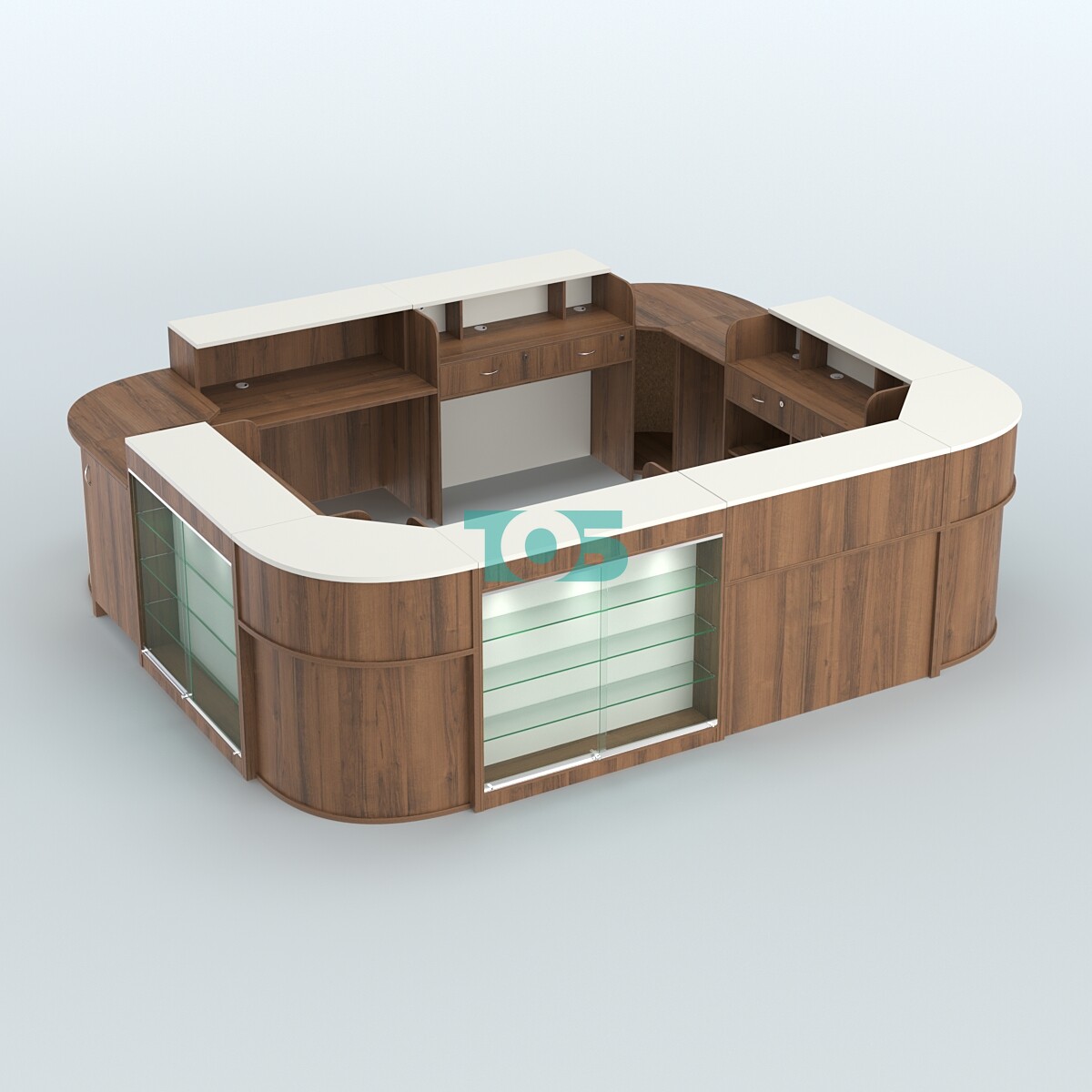 - фасад ресепшенов Лайт представляет из себя витрину с тремя стеклянными полками (две из них с зеркальными полками). Верхний фриз витрин укомплектован тремя светильниками, которые освещают товар на полках. Лицевая часть витрин защищена раздвижными стеклянными шторками на мини роликовых направляющих (аналог шкафа-купе) и закрывается на врезной замок. Со стороны продавца предусмотрены два выдвижных ящика с замком и ниша с полкой, куда удобно складировать коробки с товаром и пр;