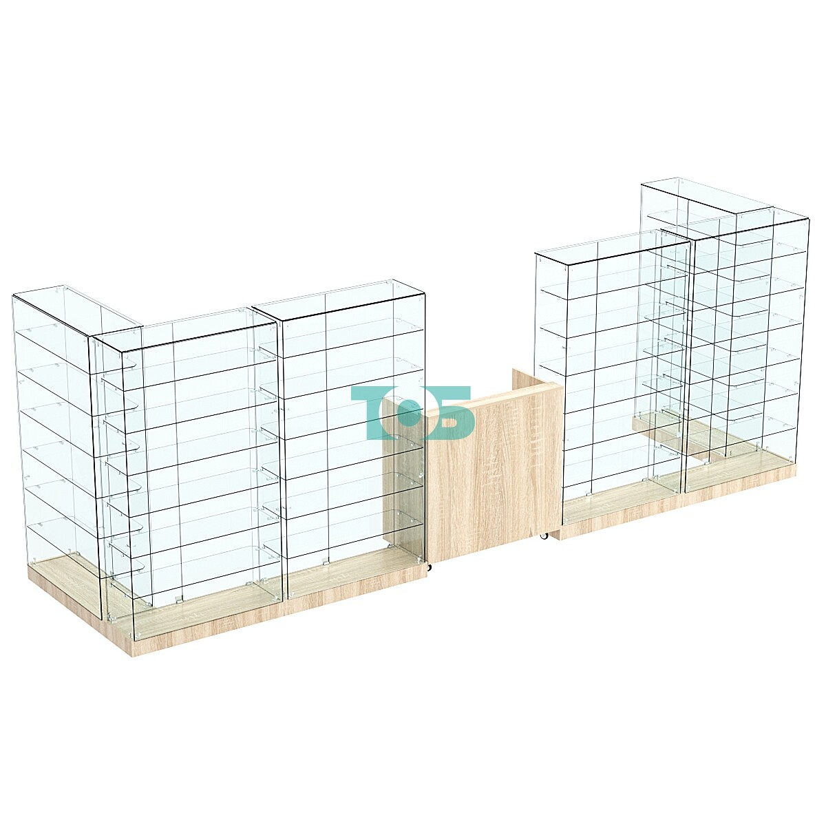Наличие шести стеклянных полок с каждой стороны, расстояние между полками составляет 210 мм, что позволяет организовать пространство для размещения товаров.