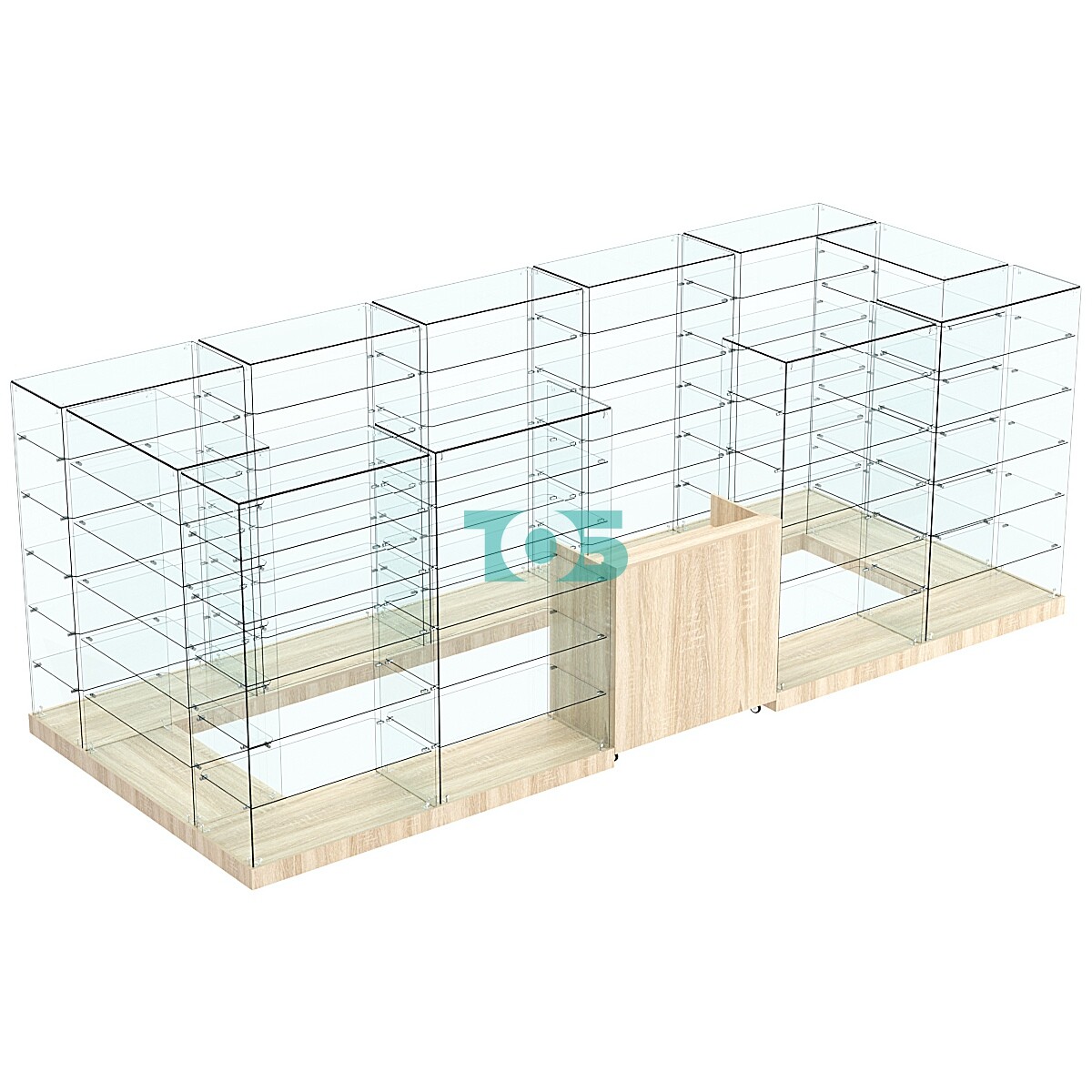 Размеры: общая площадь — 8,1 кв. м, однако габаритные размеры могут быть изменены в зависимости от стандартных блоков витрин, что позволяет адаптировать островок под конкретные условия размещения.