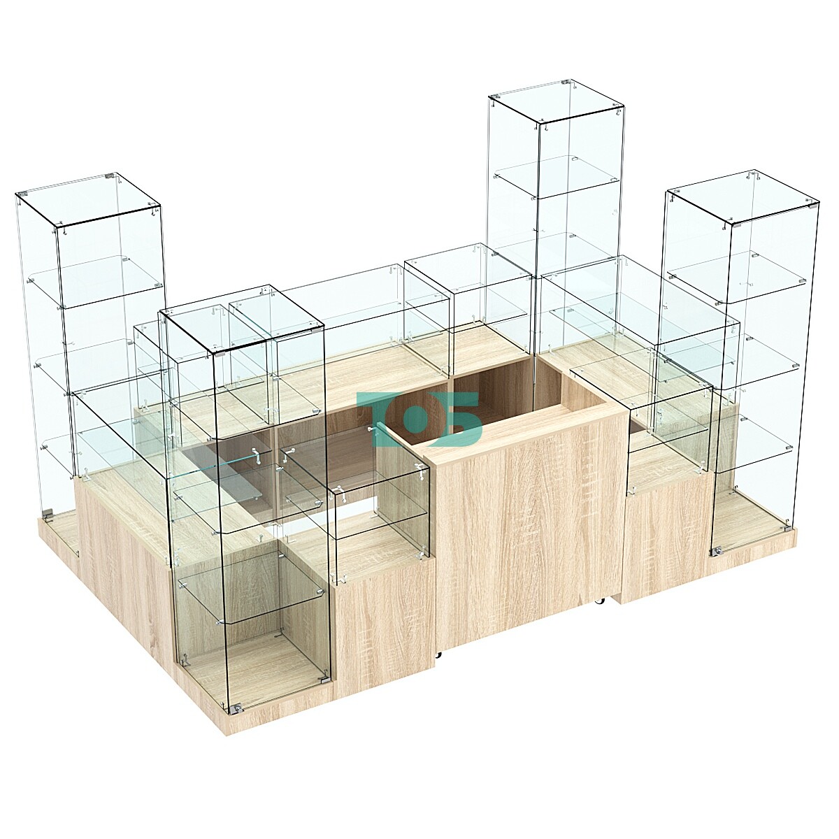 тип: стеклянные трёхполочные витрины с низкими подиумами;