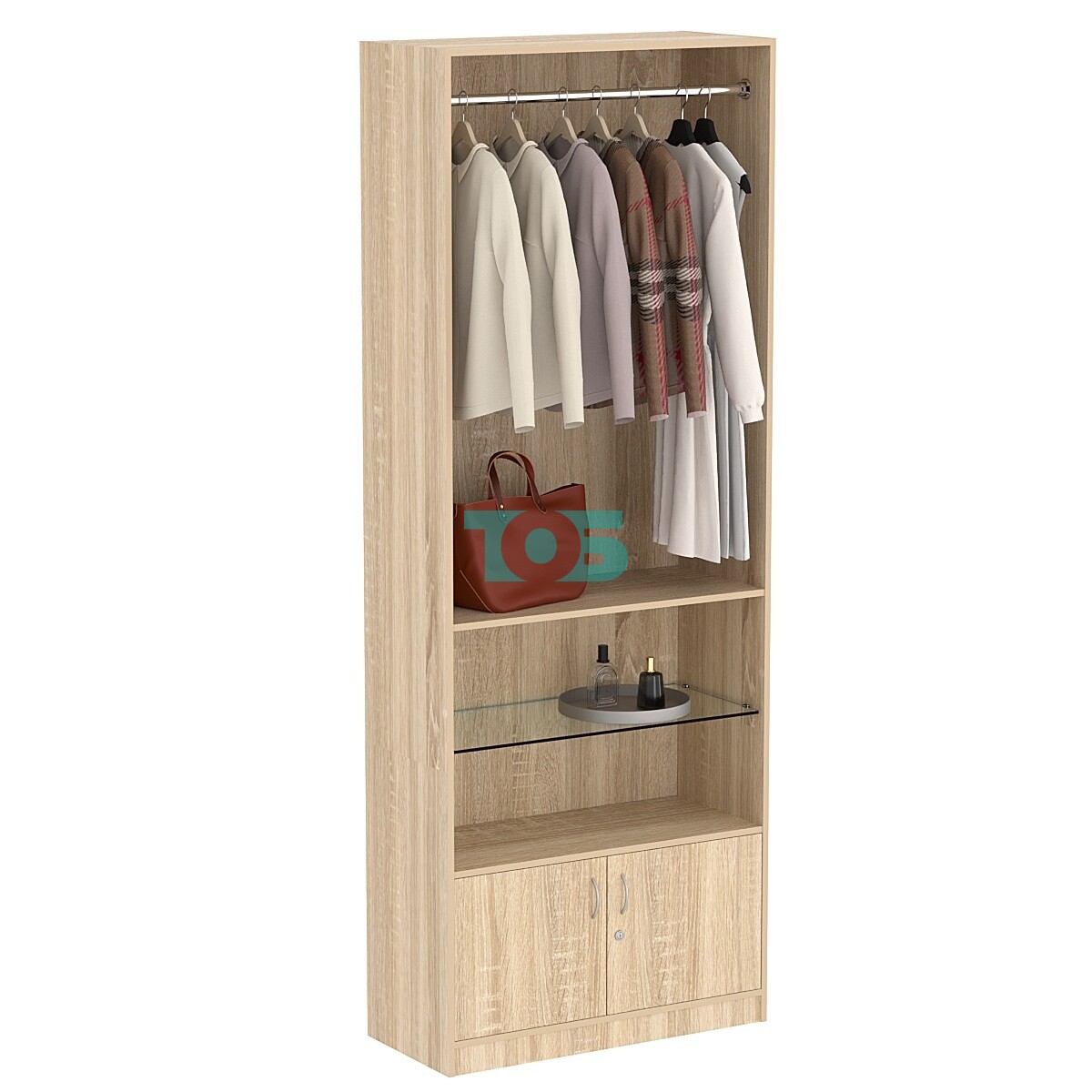 Полки: одна полка из ДСП толщиной 16 мм и одна полка из прозрачного стекла толщиной 8 мм предназначены для накопления размерного ряда товара, что позволяет удобно организовать хранение.
