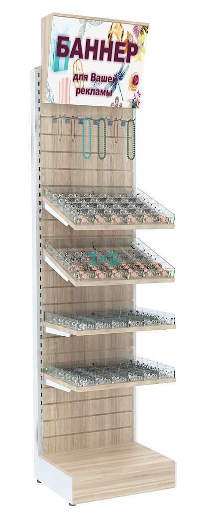 - стеллаж включает четыре полки из ДСП 25 мм с 30-ю ячейками из оргстекла на каждой для демонстрации Товара покупателю;