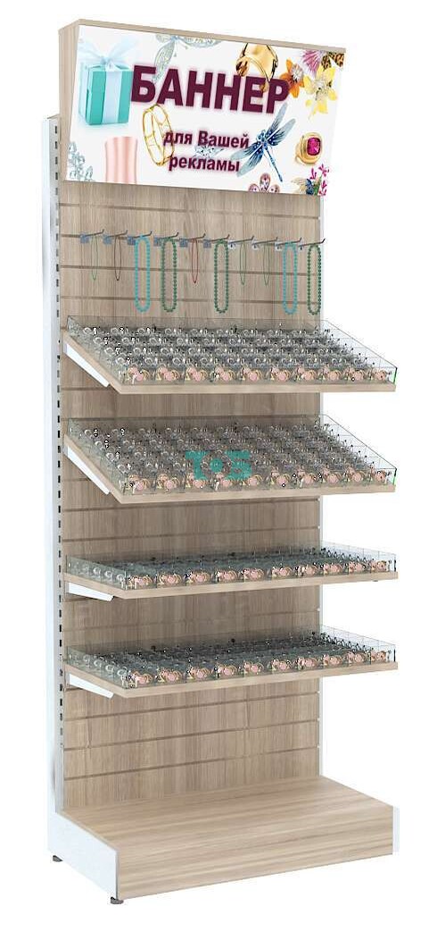 - стеллаж включает четыре полки из ДСП 25 мм с 50-ю ячейками из оргстекла на каждой для демонстрации Товара покупателю;