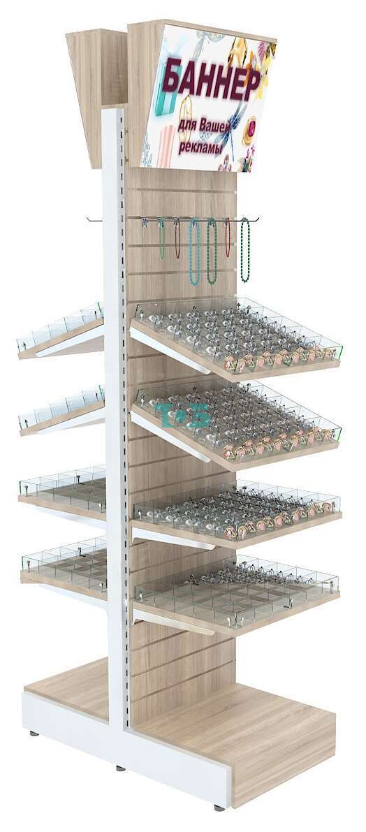 - стеллаж включает восемь полок из ДСП 25 мм с 30-ю ячейками из оргстекла на каждой для демонстрации Товара покупателю;