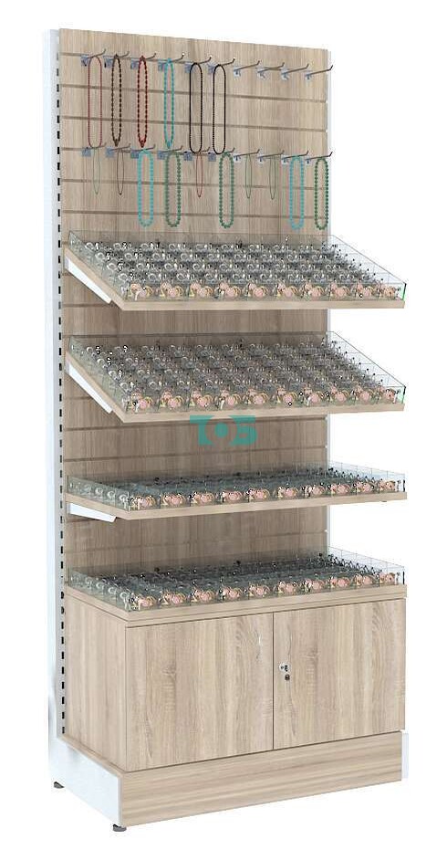 - стеллаж включает три полки из ДСП 25 мм с 50-ю ячейками из оргстекла на каждой для демонстрации Товара покупателю;