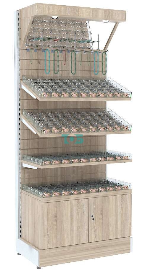 - стеллаж включает три полки из ДСП 25 мм с 50-ю ячейками из оргстекла на каждой для демонстрации Товара покупателю;