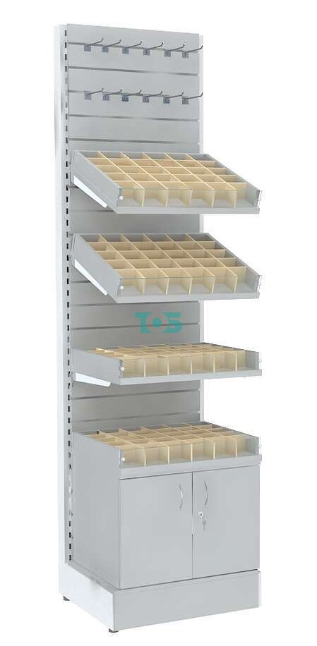 - стеллаж включает четыре полки из ДСП 25 мм с прозрачным фронтальным стеклом и 30-ю ячейками из фанеры на каждой для демонстрации Товара покупателю;