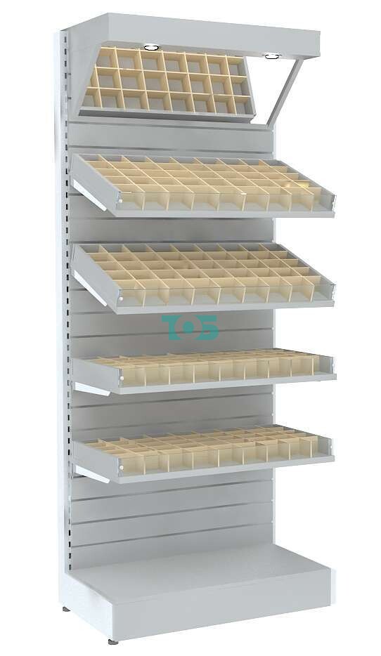 Островной стеллаж с накопителем ячейками из фанеры и свет коробом узкий серии КЛАСТЕР №1 (240 ячеек)