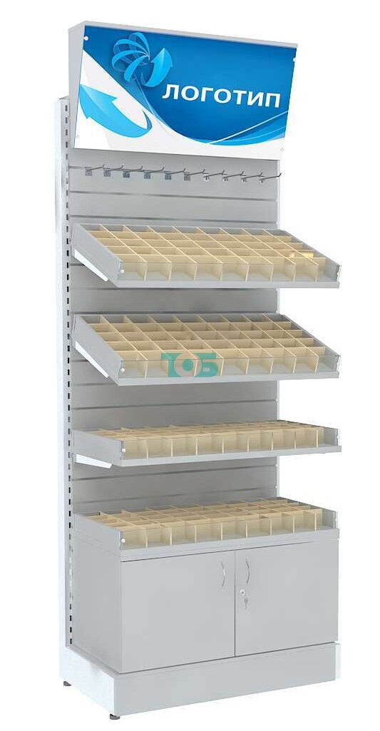 - стеллаж включает четыре полки из ДСП 25 мм с прозрачным фронтальным стеклом и 45-ю ячейками из фанеры на каждой для демонстрации Товара покупателю;