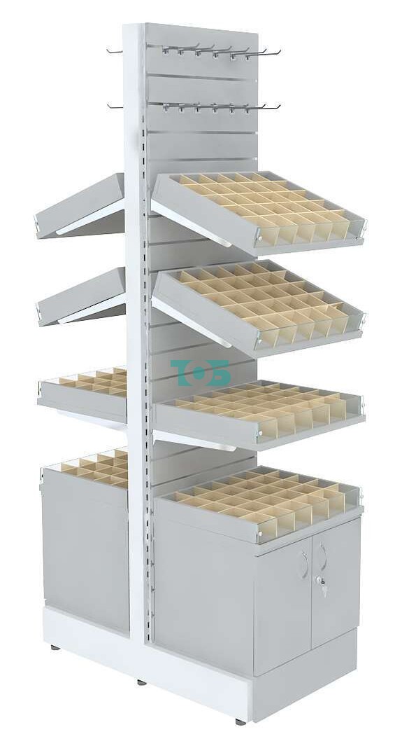 - стеллаж включает восемь полок из ДСП 25 мм с прозрачным фронтальным стеклом и 30-ю ячейками из фанеры на каждой для демонстрации Товара покупателю;
