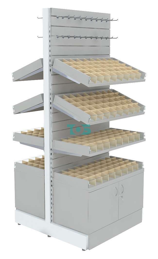 - стеллаж включает восемь полок из ДСП 25 мм с прозрачным фронтальным стеклом и 45-ю ячейками из фанеры на каждой для демонстрации Товара покупателю;