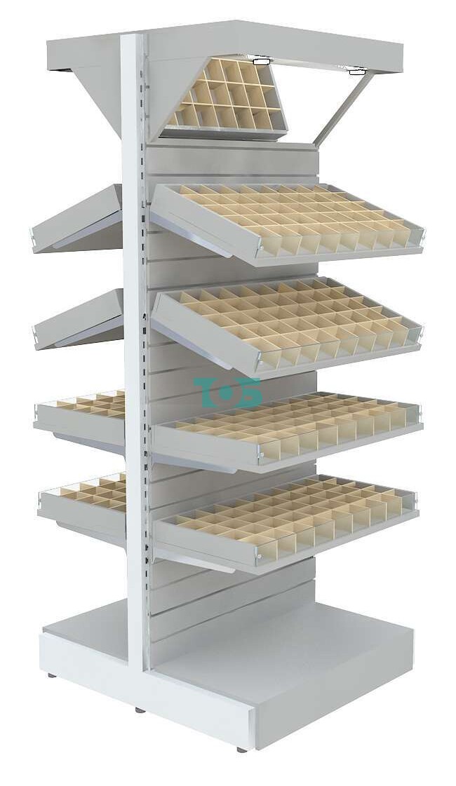 - стеллаж включает восемь полок из ДСП 25 мм с прозрачным фронтальным стеклом и 45-ю ячейками из фанеры на каждой для демонстрации Товара покупателю;