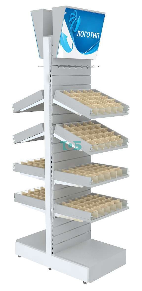 - стеллаж включает восемь полок из ДСП 25 мм с 30-ю ячейками из оргстекла на каждой для демонстрации Товара покупателю;