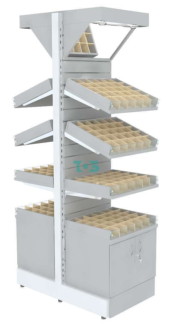 - стеллаж включает восемь полок из ДСП 25 мм с прозрачным фронтальным стеклом и 30-ю ячейками из фанеры на каждой для демонстрации Товара покупателю;