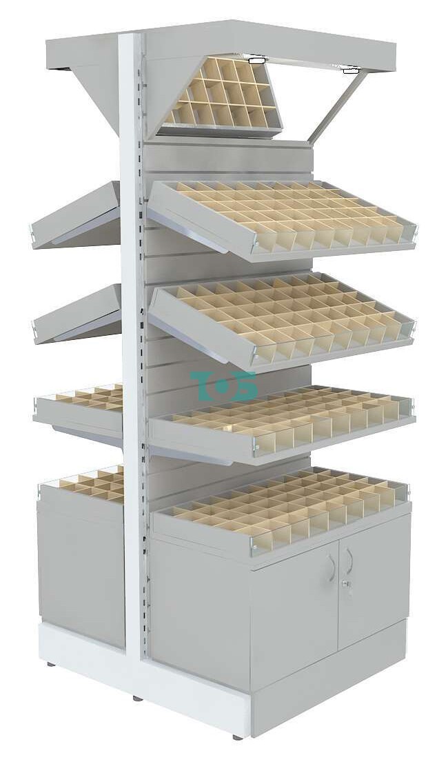 - стеллаж включает восемь полок из ДСП 25 мм с прозрачным фронтальным стеклом и 45-ю ячейками из фанеры на каждой для демонстрации Товара покупателю;