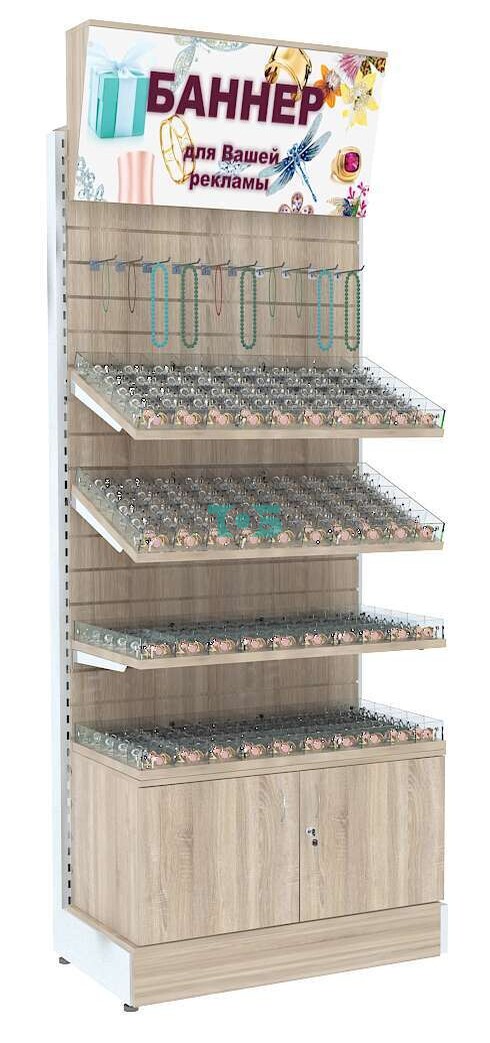 - стеллаж включает три полки из ДСП 25 мм с 50-ю ячейками из оргстекла на каждой для демонстрации Товара покупателю;