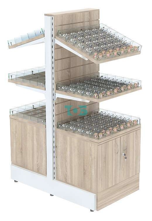 - стеллаж включает четыре полки из ДСП 25 мм с 30-ю ячейками из оргстекла на каждой для демонстрации Товара покупателю;
