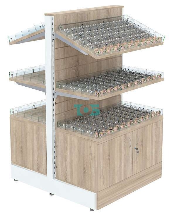- стеллаж включает четыре полки из ДСП 25 мм с 50-ю ячейками из оргстекла на каждой для демонстрации Товара покупателю;