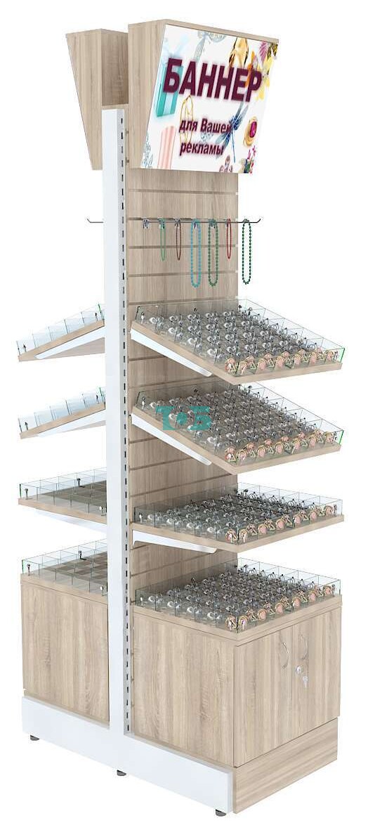 - стеллаж включает восемь полок из ДСП 25 мм с 30-ю ячейками из оргстекла на каждой для демонстрации Товара покупателю;