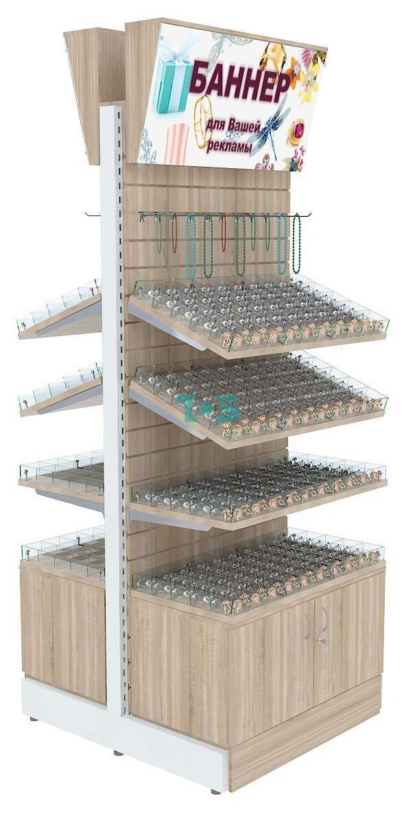- стеллаж включает восемь полок из ДСП 25 мм с 50-ю ячейками из оргстекла на каждой для демонстрации Товара покупателю;