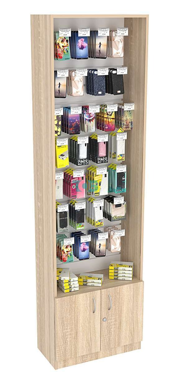 Нижнее отделение: в нижней части витрины расположена распашная дверь с замком, что позволяет организовать хранение товаров и обеспечить их безопасность.
