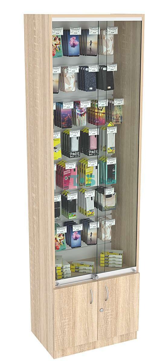 Нижнее отделение: в нижней части витрины расположена распашная дверь с замком, что позволяет организовать хранение товаров и обеспечить их безопасность.