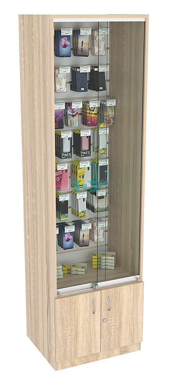 Нижнее отделение: в нижней части витрины расположена распашная дверь с замком, что позволяет организовать хранение товаров и обеспечить их безопасность.