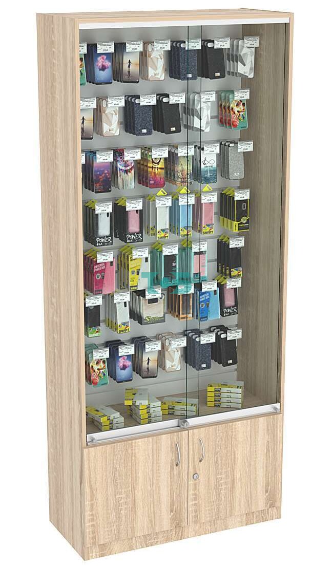 Нижнее отделение: в нижней части витрины расположена распашная дверь с замком, что позволяет организовать хранение товаров и обеспечить их безопасность.