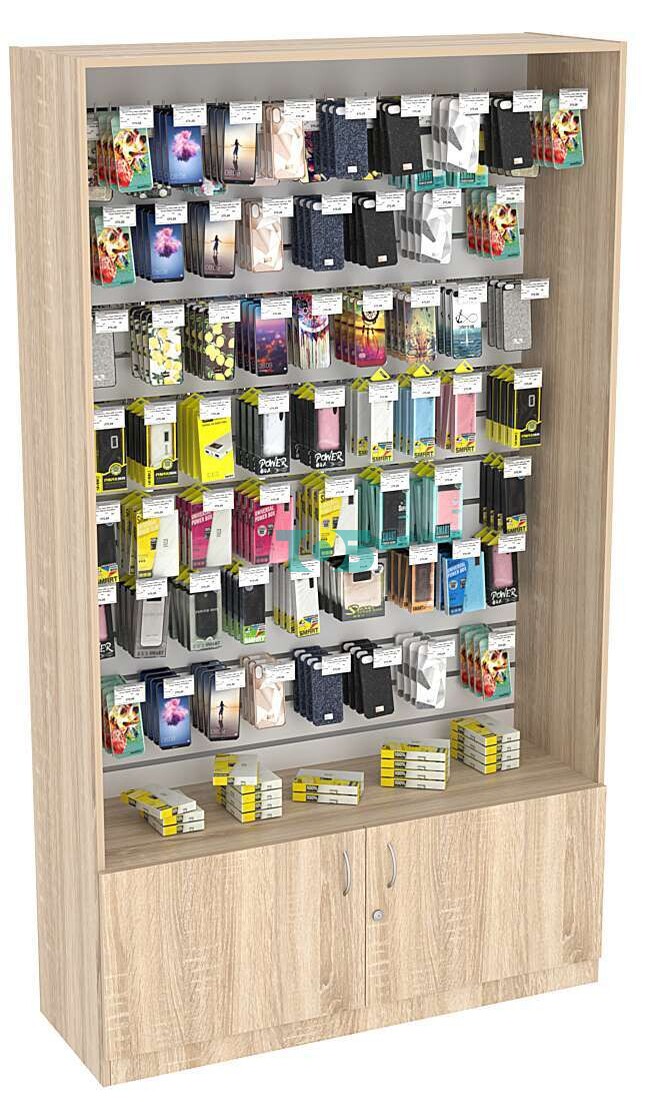 Нижнее отделение: в нижней части витрины расположена распашная дверь с замком, что позволяет организовать хранение товаров и обеспечить их безопасность.