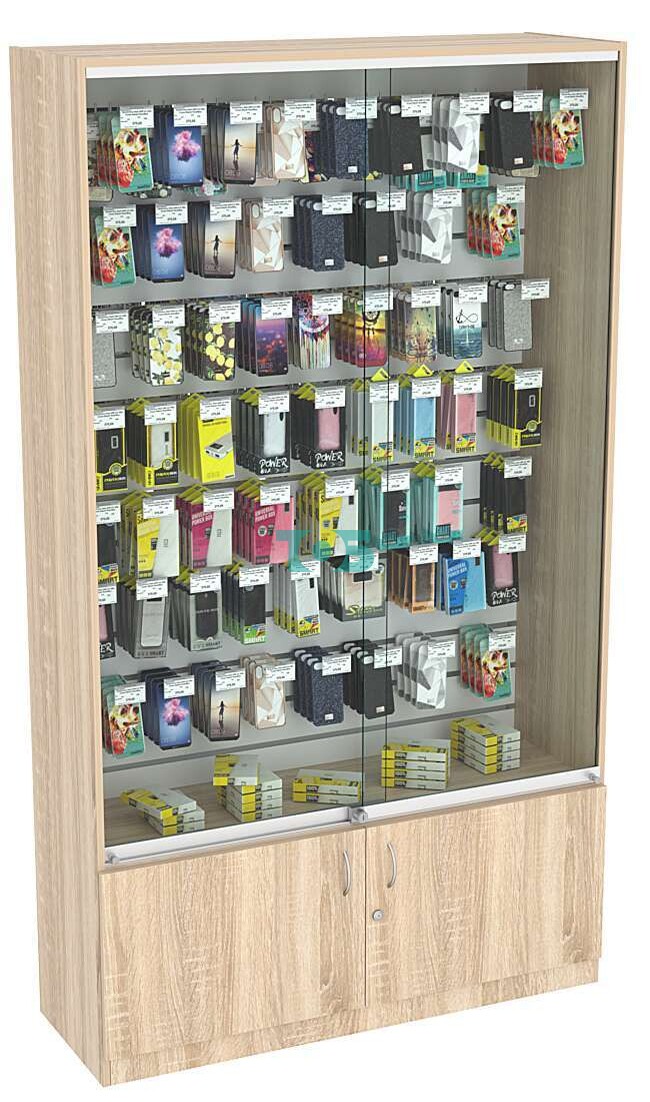 Верхняя часть: оборудована раздвижными стеклянными шторками с врезным замком, что обеспечивает лёгкий доступ к товарам и возможность их демонстрации.