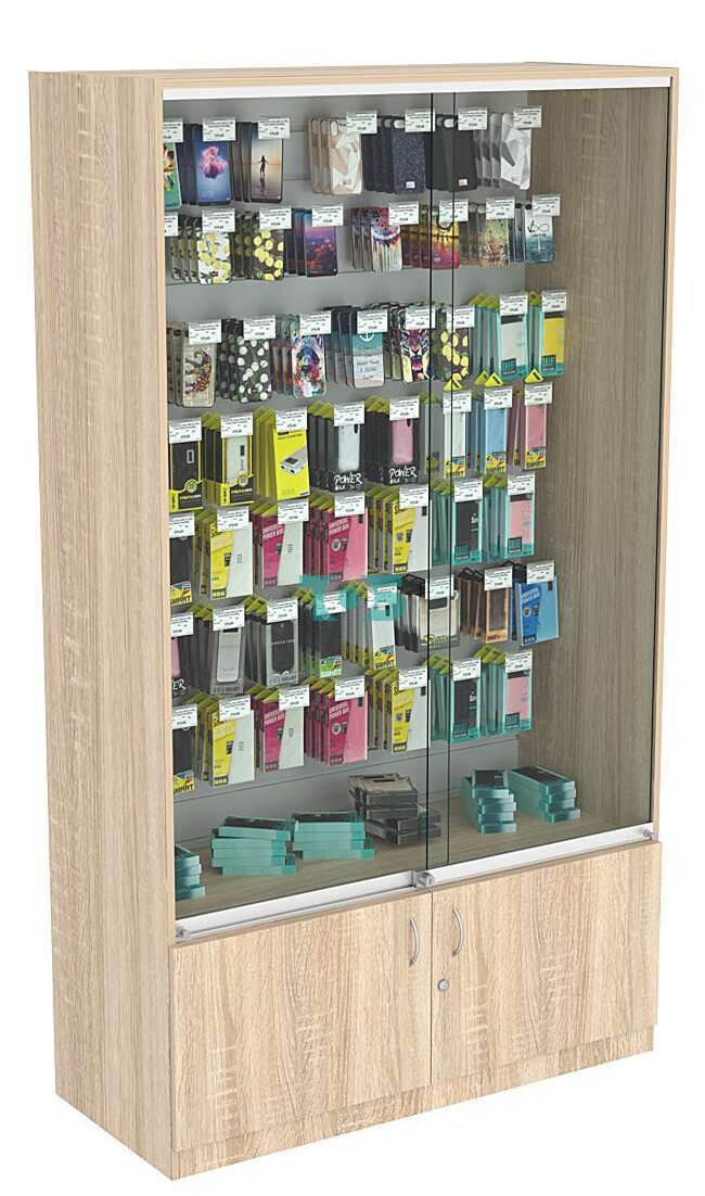 Верхняя часть: оборудована раздвижными стеклянными шторками с врезным замком, что обеспечивает лёгкий доступ к товарам и возможность их демонстрации.