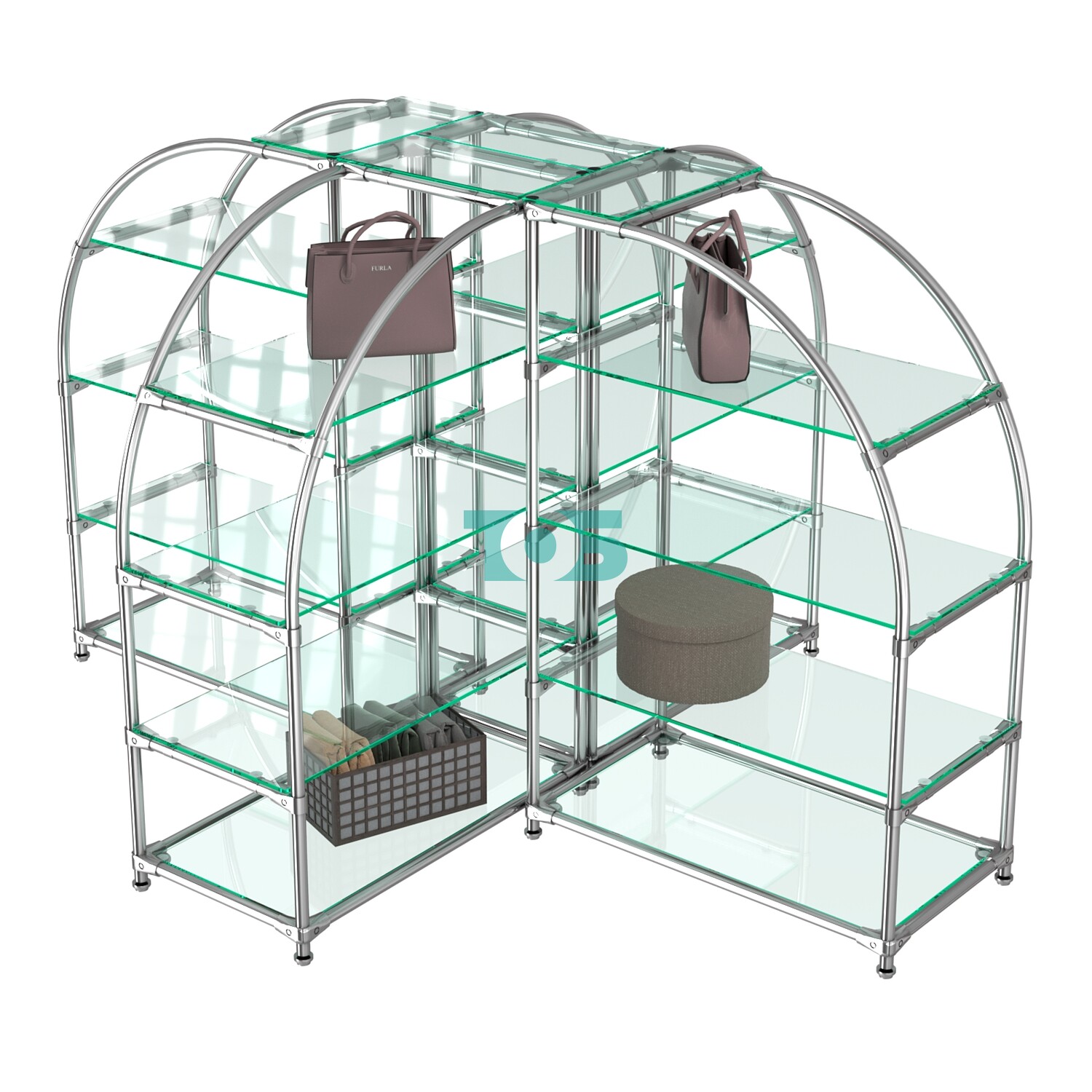 Двадцать полок из стекла толщиной 8 мм: Обеспечивают надежное размещение товаров, при этом сохраняя прозрачность и легкость конструкции.