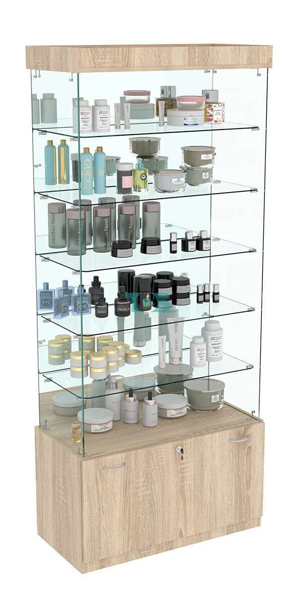 • Накопитель с выдвижным ящиком: в нижней части витрины расположен глубокий выдвижной ящик с врезным замком, который можно использовать для хранения сопутствующих товаров или документов, что добавляет дополнительное пространство для организации.