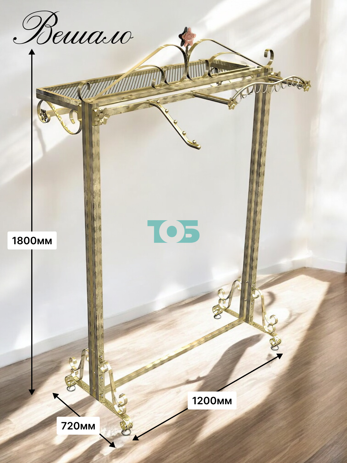 - нижняя и верхняя часть вешала, а также поручни декорированы элементами художественной ковки - виньетками и цветочками;