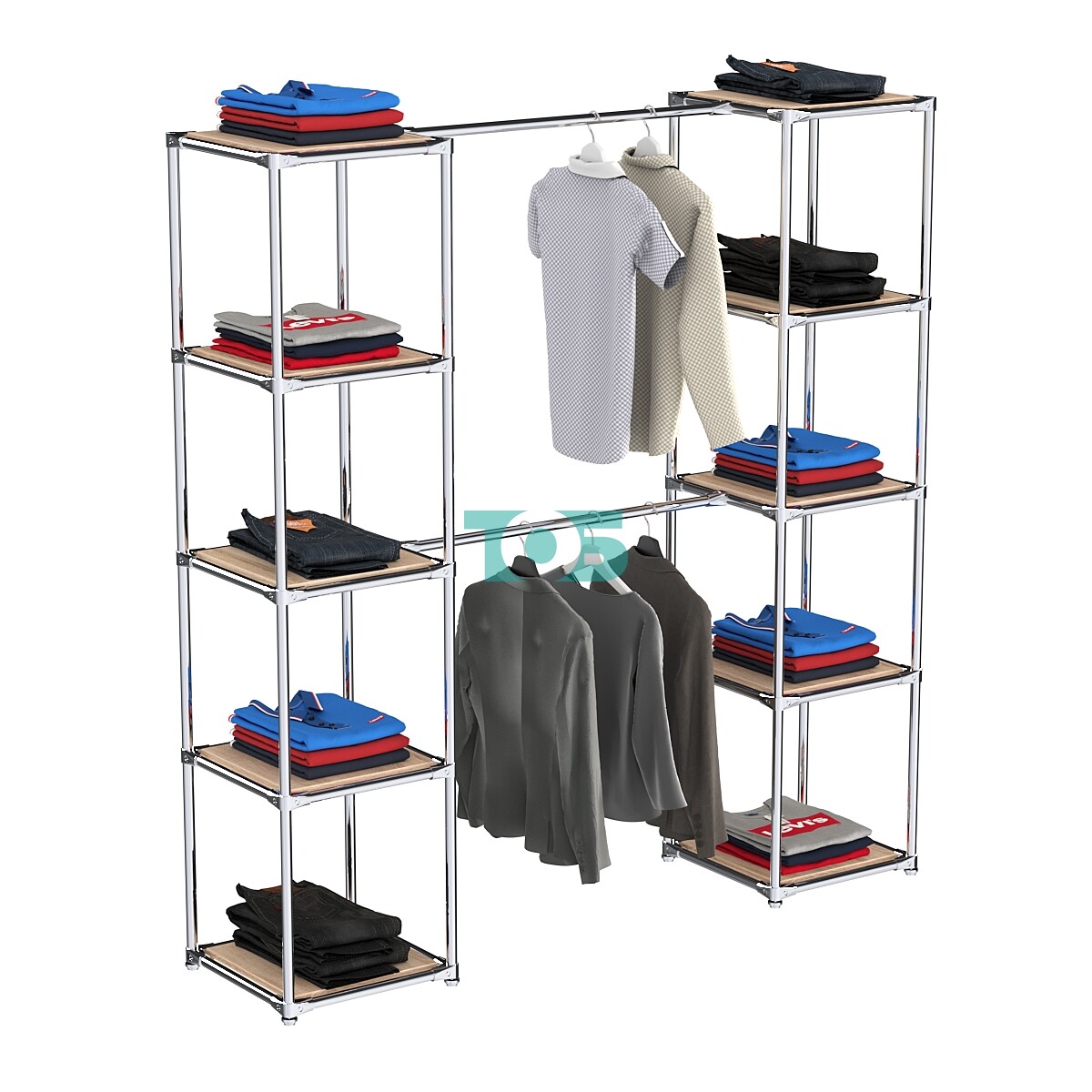 Превратите ваш гардероб или магазин в организованное и стильное пространство с вешалом для одежды с глухими полками Мега №2-3. Этот многофункциональный предмет мебели сочетает в себе современный дизайн и практичность, обеспечивая удобное размещение одежды и аксессуаров, а также элегантный внешний вид.