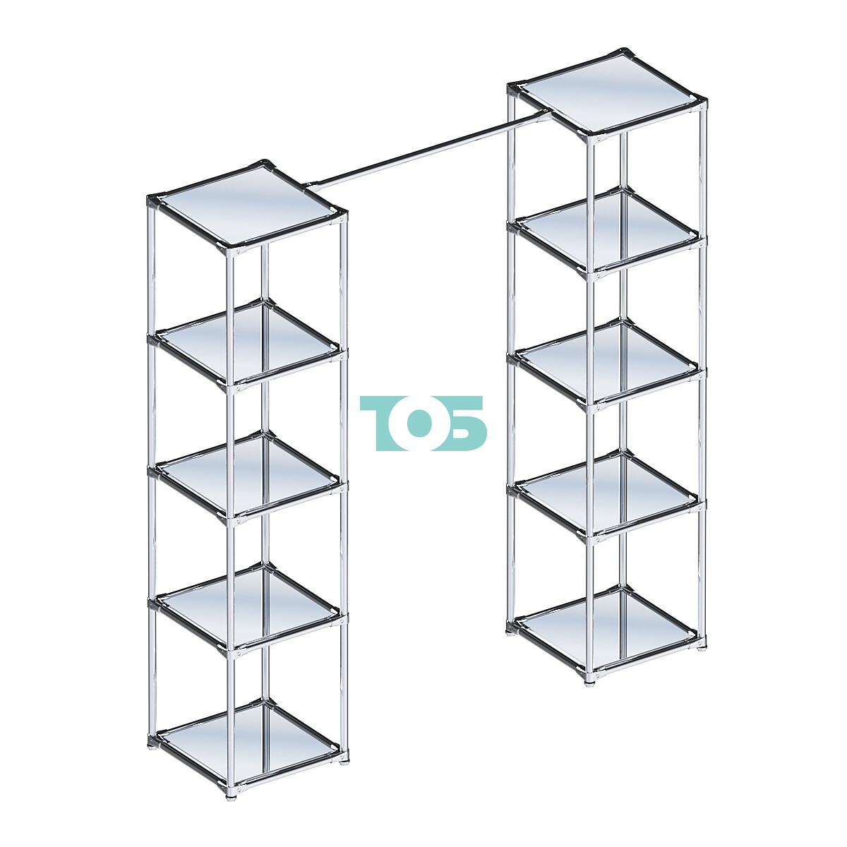 Два стаканчика размером 450 х 450 мм со сдвоенными полками из ДСП 16 мм и зеркала в обвязке из хромированных труб: Прочные и стильные элементы, которые добавляют современный акцент и позволяют эффективно использовать пространство для демонстрации аксессуаров и мелких предметов, а также визуально расширяют пространство.
