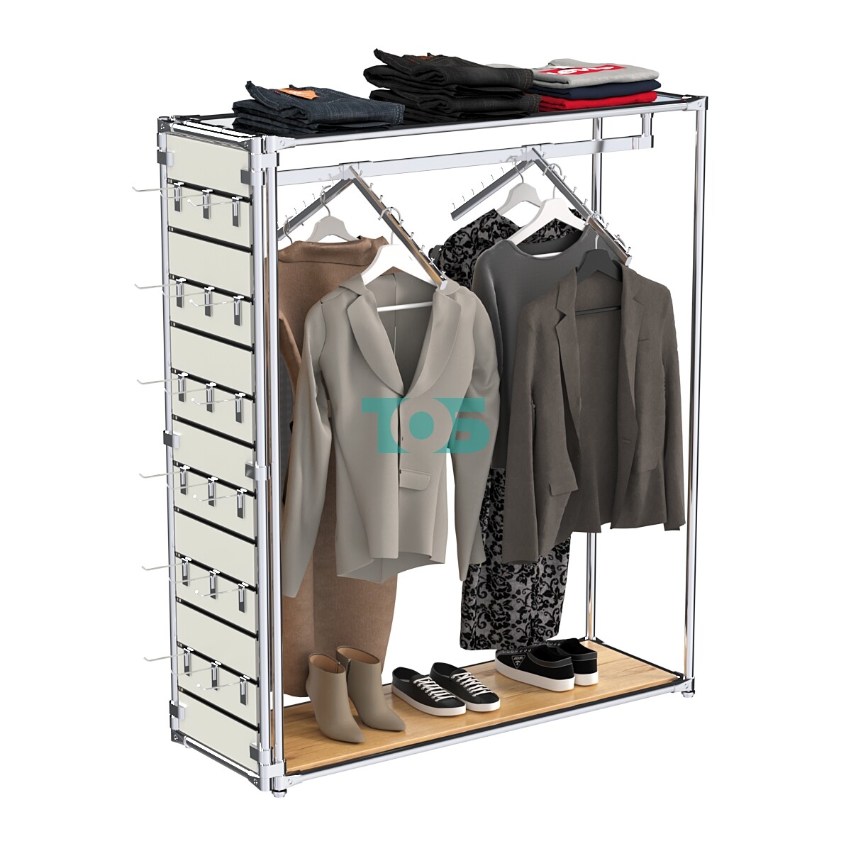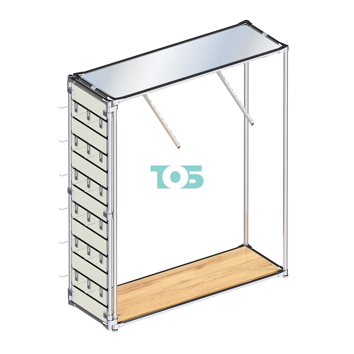 Прочность и надежность: Хромированный каркас и зеркальная верхняя крышка обеспечивают безопасное размещение одежды и аксессуаров.