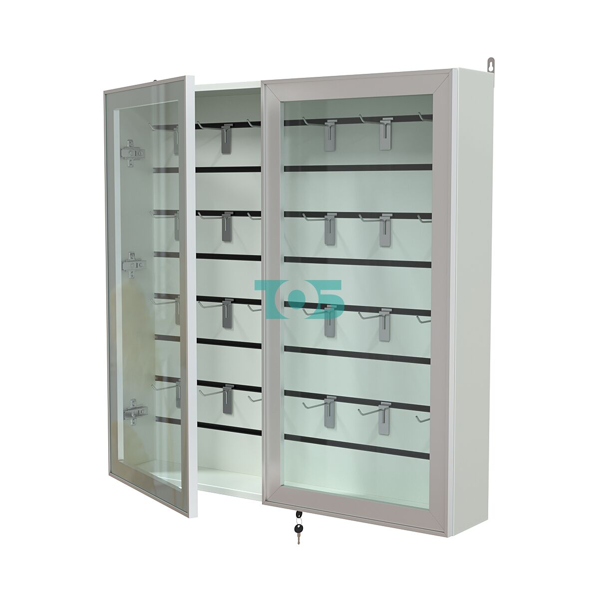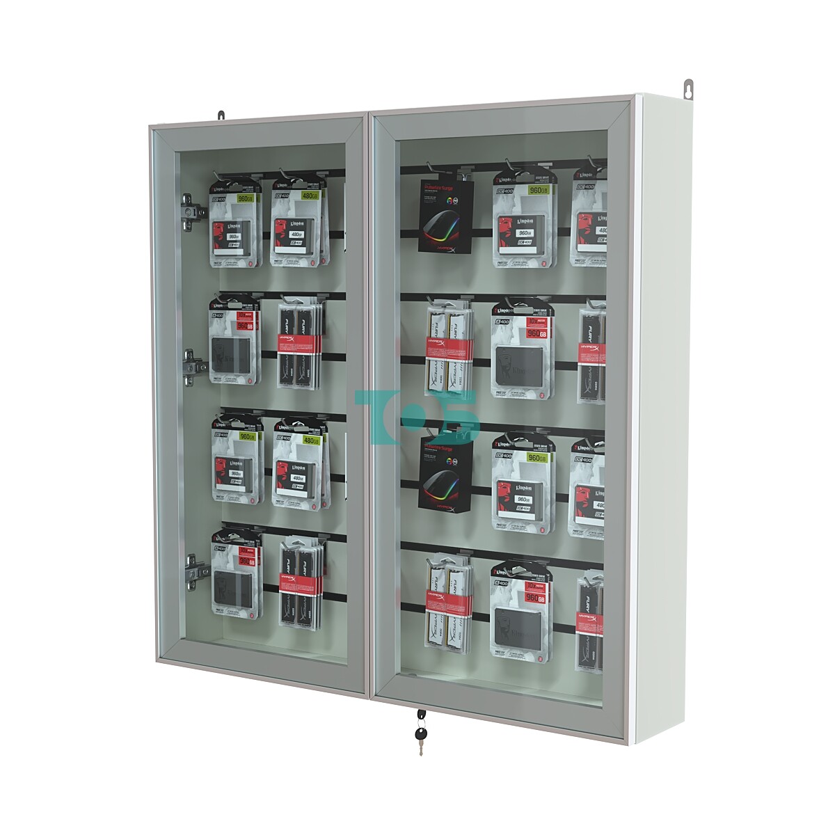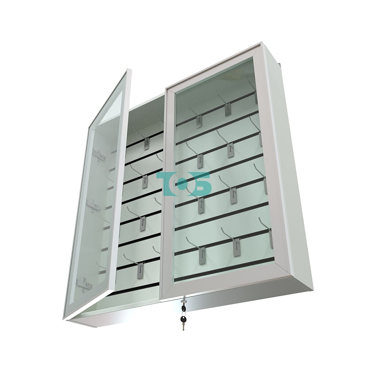Две стеклянные распашные двери в алюминиевом каркасе с надежным замком – обеспечивают удобный доступ к содержимому и надежную защиту экспонатов